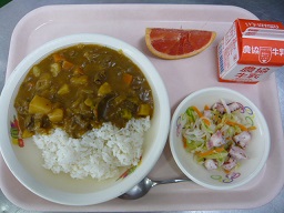 カレーライス、たこサラダ、グレープフルーツ、牛乳