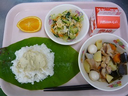 ごはん、黄粉、含め煮、ホロホロ和え、オレンジ、牛乳