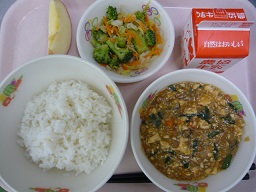ごはん、麻婆豆腐、ごま和え、りんご、牛乳