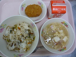 ビーフライス、たまごスープ、かぼちゃコロッケ、牛乳