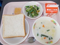胚芽食パン、クリームシチュー、アスパラサラダ、りんごジャム、牛乳