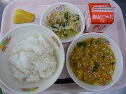 ごはん、豆腐のカレー煮、もやしナムル、パイナップル、牛乳