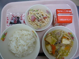 ごはん、厚揚げと肉のみそ炒め、マカロニサラダ、ごぼう昆布、牛乳