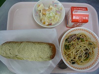 黄粉nパン、和風スパゲッティ、ヨーグルト和え、牛乳