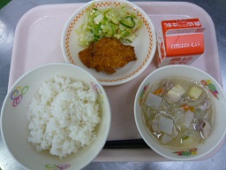 ごはん、チキンカツ、キャベツサラダ、豚汁、牛乳