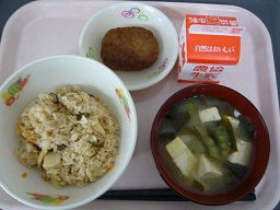 山菜ごはん、ハンバーグ、えんどうの味噌汁、牛乳