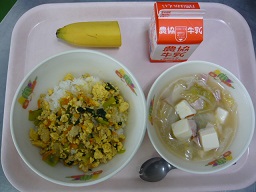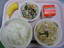 ごはん、とり野菜、磯香和え、バナナ、牛乳