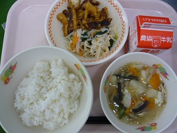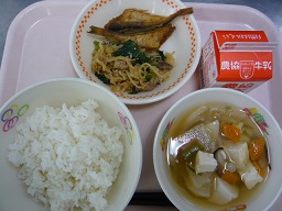 ごはん、ハタハタのいしる揚げ、切り干し大根のピリ辛炒め、のっぺい汁、牛乳