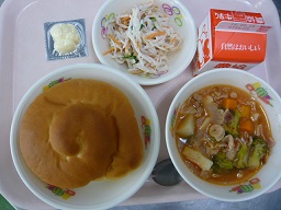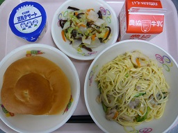 ミルクロール、焼きラーメン、かぶ和え、豆乳デザート、牛乳