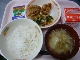 ごはん、とりのから揚げ、おかか和え、つるも汁、ふりかけ、牛乳