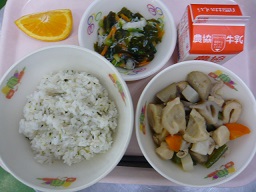 菜めし、いりどり、しらし和え、オレンジ、牛乳