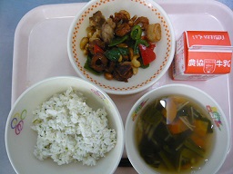 菜めし、白玉汁、とりとナッツの炒め煮、牛乳