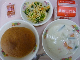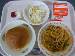 胚芽パン、スパゲッティソテー、ヨーグルト和え、ジャム・マーガリン、牛乳
