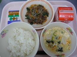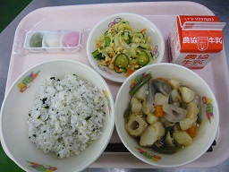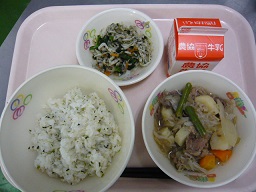 菜めし、肉じゃが、磯香和え、牛乳