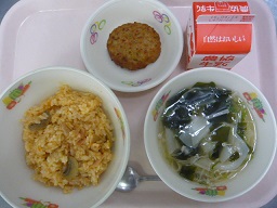 チキンライス、ワンタンスープ、豆腐ハンバーグ、牛乳