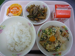 ごはん、卵とじ、五目きんぴら、みかんゼリー、牛乳
