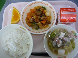 ごはん、酢豚、中華スープ、オレンジ、牛乳