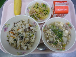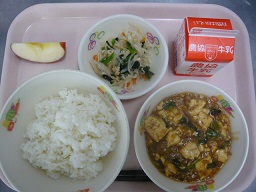 ごはん、麻婆豆腐、五目なます、りんご、牛乳
