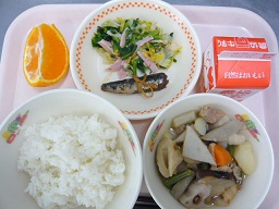 ごはん、いりどり、イワシの生姜煮、白菜のおかか和え、いよかん、牛乳