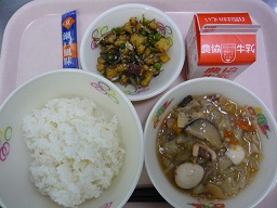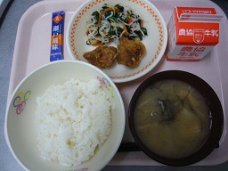 ごはん、とりのから揚げ、磯香和え、もぞこ汁、ふりかけ、牛乳