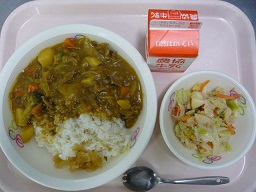 カレーーライス、ツナサラダ、福神漬け、牛乳