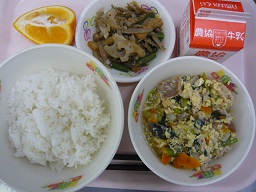 どはん、卵とじ、五目きんぴら、いよかん、牛乳