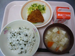 ワカメごはん、トンカツ、キャベツサラダ、みそ汁、牛乳