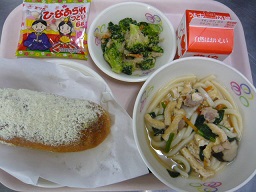 黄粉揚げパン、五目うどん、ごま和え、ひなあられ、牛乳