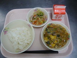 ごはん、麻婆豆腐、五目なます、りんご、牛乳