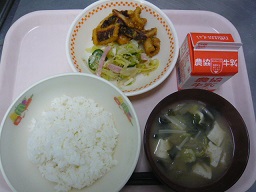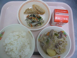 ごはん、肉じゃが、磯香あえ、ギョウザ、牛乳