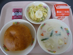 胚芽パン、クリームシチュー、卵サラダ、クリーム、牛乳
