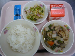 ごはん、とり野菜、ポテトサラダ、りんご、牛乳
