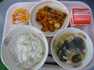 ごはん、酢豚、みそ汁、みかんゼリー、牛乳