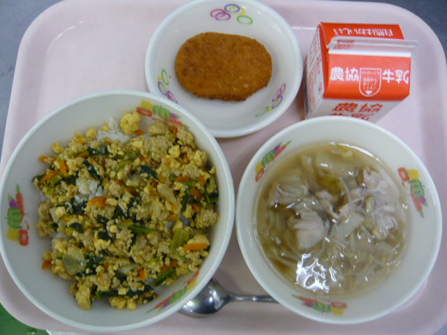 そぼろごはん、中華スープ、コロッケ、牛乳