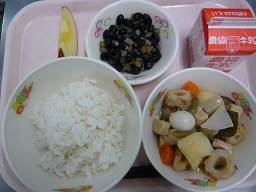 ごはん、含め煮、黒豆、りんご、牛乳