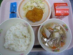 ごはん、チキンカツ、キャベツサラダ、のっぺい汁、のりの佃煮、牛乳
