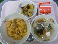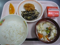 ごはん、とりのから揚げ、なます、みそ汁、牛乳