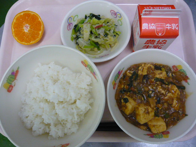 ごはん、麻婆豆腐、しらす和え、みかん、牛乳