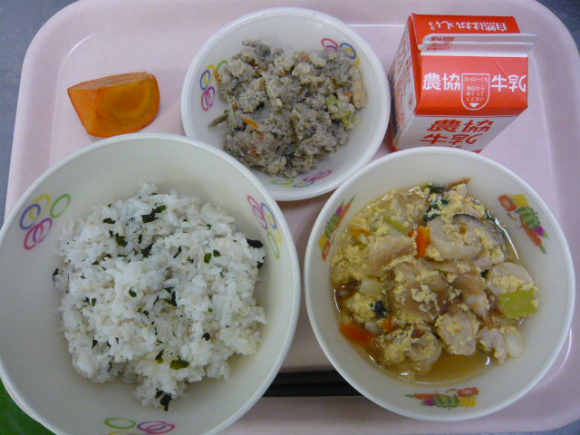 わかめごはん、たまごとじ、卯の花炒り煮、柿、牛乳
