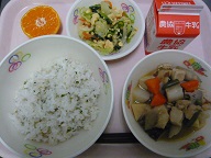 ごはん、とり野菜、竹輪の磯辺揚げ、きんぴら、牛乳