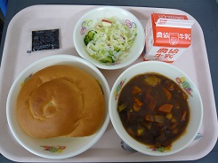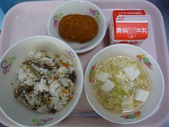 ビーフライス、たまごスープ、コロッケ、牛乳