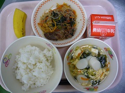ごはん、トック、チャプチェ、バナナ、牛乳