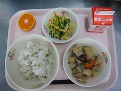 菜めし、いりどり、ホロホロ和え、みかん、牛乳
