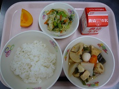 ごはん、チキンフライ、かじめのソテー、けんちん汁、牛乳