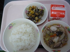 ごはん、八宝菜、小魚揚げ煮、牛乳