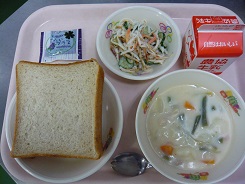 胚芽食パン、クリームシチュー、カミカミサラダ、ブリーベリージャム、牛乳