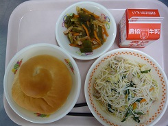 ミルクロール、焼きビーフン、茎ワカメのソテー、牛乳