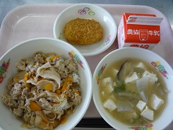 豚丼、けんちん汁、かぼちゃコロッケ、牛乳