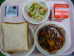 ビーフライス、たまごスープ、コロッケ、牛乳