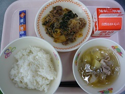 ごはん、チャプチェ、千切りスープ、ふりかけ、牛乳